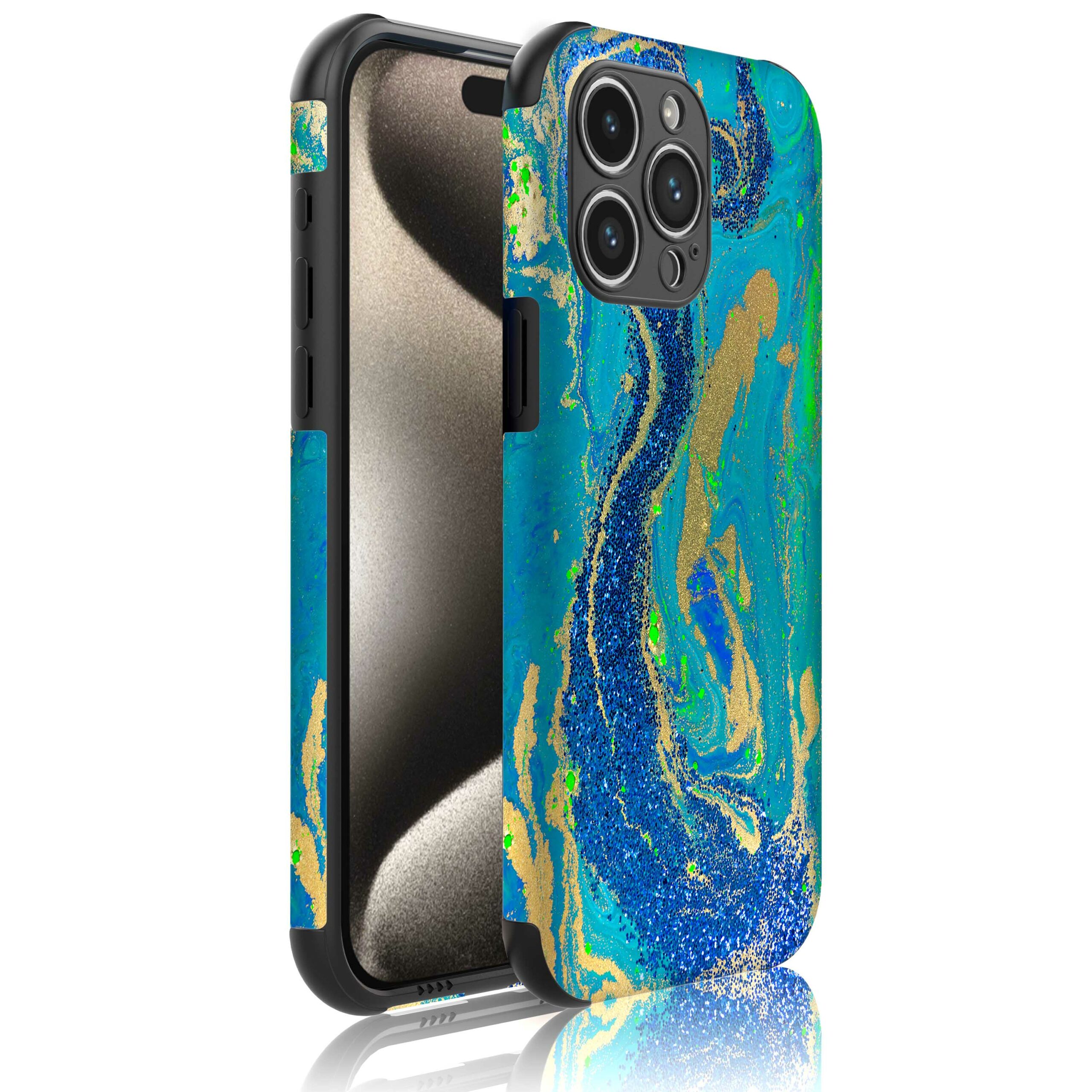 1x Telefoonhoesje geschikt voor iPhone 15 Pro Max met blauw groen goud marmer opdruk